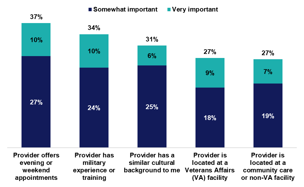 The most important factors for Veterans when looking for a mental health care provider were that the provider offers evening or weekend appointments (37%), the provider has military experience or training (34%), and the provider has a similar cultural background (31%).Veterans put less importance on the provider’s facility type and rated the importance of being at a VA facility (27%) or a community care facility (27%) similarly.The provider offering evening or weekend appointments was rated as more important by Veterans ages 18-49 (49%) and ages 50-64 (40%) than by those ages 65+ (29%).Being located at a VA facility was rated as more important by the following: (1) Veterans with an income under $50,000 (42%) vs. $50,000-$99,999 (21%) and $100,000+ (23%), and (2) Veterans with a high school education or less (33%) and some college (29%) vs. bachelor’s degree or higher (20%).Providers’ availability and background are important to Veterans