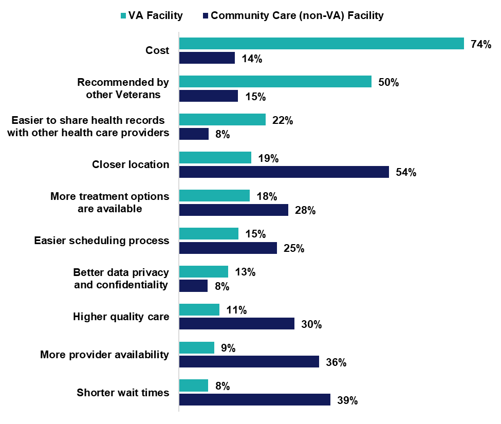 2. Cost is the top reason why Veterans get mental health care at a VA facility, while a closer location is the top reason for choosing a community care facility.