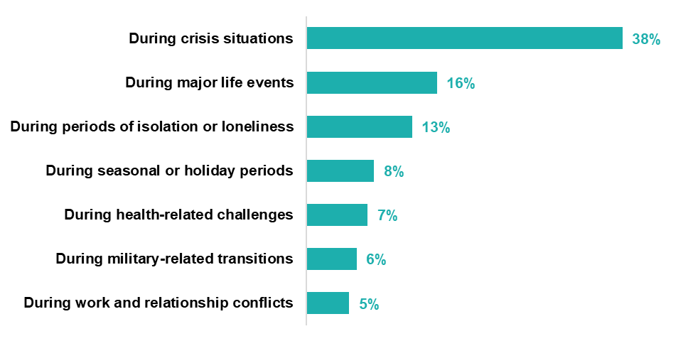 Respondents said that Veterans are most likely to look for mental health care during crisis situations (such as when problems severely affect their daily life or when family or friends express serious concern; 38%), followed by during major life events (such as job loss, divorce, loss of a loved one, moving; 16%) and during periods of isolation or loneliness (13%).Veterans are most likely to look for mental health care during a crisis