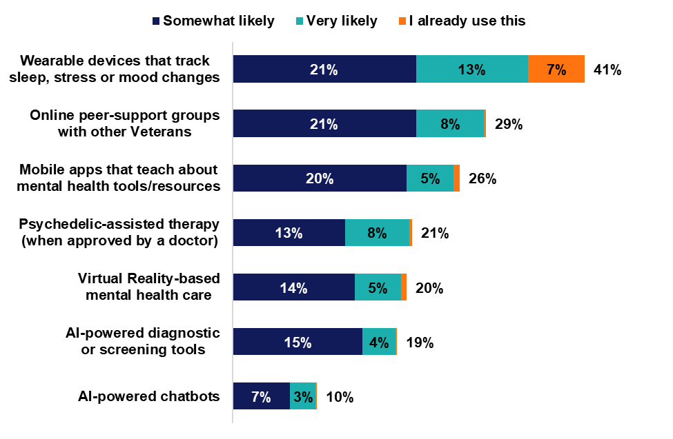5. Veterans are most likely to use wearable devices compared to other new forms of mental health care.