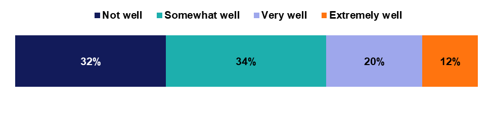 One-third of Veterans said their family and friends understand their mental health needs related to their military service ‘very’ or ‘extremely well’ (32%), although few selected the highest rating of ‘extremely well’ (12%). However, one-third of Veterans said their family and friends do not understand their mental health needs well (32%), with another third falling in the middle at ‘somewhat well’ (34%).Veterans with a high school education or less were more likely to say their family and close friends understand their mental health needs ‘very’ or ‘extremely well’ (40%) compared to those with some college (28%) or a bachelor’s degree or higher (28%), as well as Veterans ages 65+ (37%) and ages 50-64 (34%*) vs. those ages 18-49 (22%).Opinions are mixed on whether family/friends understand Veterans’ mental health needs related to their military service