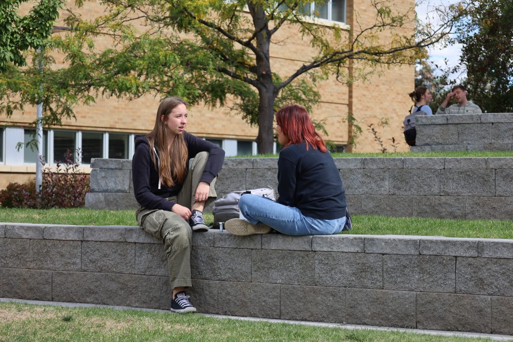 Friends chatting in the McKay Quad Amphitheater. Image Credit: Katherine MacDonald
