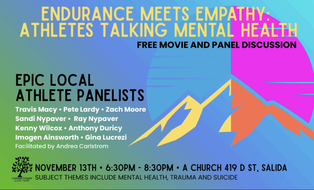 Chaffee County Public Health will host “Endurance Meets Empathy: Athletes Talking Mental Health” tomorrow evening from 6:30 to 8:30 p.m. at A Church, located at 419 D Street in Salida.