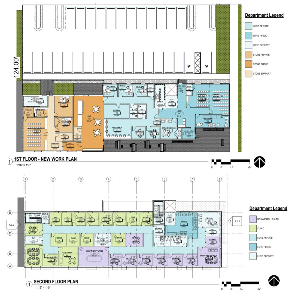 The building fronts directly onto the street, with a 30-vehicle parking lot located in the rear and accessed via the alley. Inside will be spaces for Stone and Lurie, which will offer a range of pediatric clinical services, including behavioral health, respiratory care, autism care, dietary services, and treatment for various other conditions.