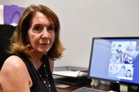 Sharon Roland, captured in a 2022 file photo, sits at a computer displaying a collage of her son, Randy, who died after an ongoing strugge with substance use. Roland was one of the family members who spoke at Denton County MHMR’s seminar and spoke about how stigma around addiction is alienating for both people with addiction and grieving family members.