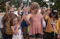 During North Texas Overdose Awareness Day in Denton in 2019. Attendees hold up purple glow sticks to commemorate those who have died from substance use.