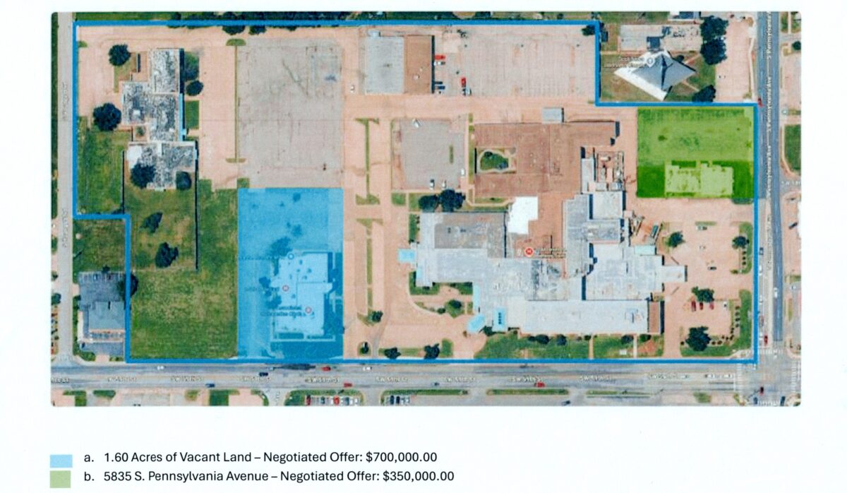 Oklahoma Department of Mental Health chief of operations Chad Carden presented an aerial photo of land the agency plans to acquire at a board meeting Thursday, Nov. 20, 2025. The land highlighted in blue and green was purchased at the meeting, while the building in the top left is currently being leased. Ultimately, the agency plans to buy the entire plot of land outlined in blue.
