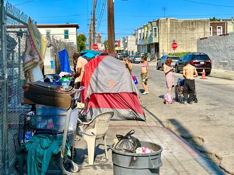 An encampment of people experiencing homelessness spread out from the Somerset El stop in Kensington. August 4, 2023. (Ali Mohsen/Billy Penn)