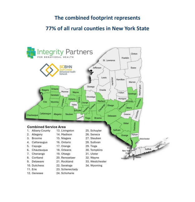 “By merging these two strong networks, we are creating New York’s most comprehensive rural behavioral health network. This merger combines community-based wisdom with advanced data analytics to ensure rural New Yorkers receive the best possible care and representation in state policymaking,” said Steven J. Harvey, Ph.D., Chief Executive Officer of Integrity Partners for Behavioral Health IPA.