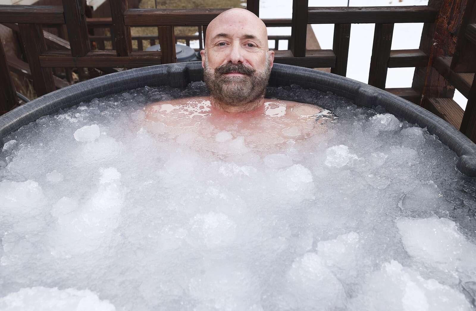 Jimmy Keene likes to clear his mind while soaking for 10 to 15 minutes in his 150-gallon tub filled will 28-degree ice water at his Silverton home. (Jerry McBride/Durango Herald)