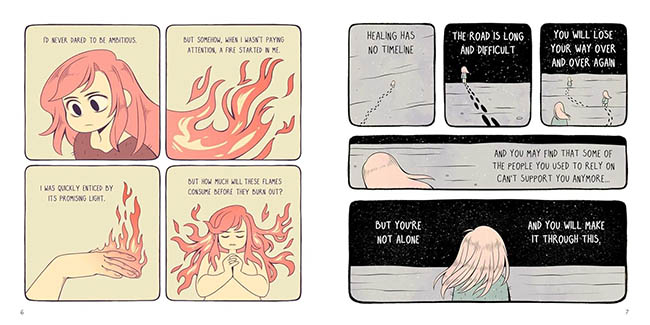 Ollerton’s deft use of comics’ visual language to convey these ideas is assured in this regard: powerful visual metaphor; inventive page layouts to convey emotional resonance; a clever use of colour to mirror the intricacy of depicted experiences and events; and considered use of lettering tricks to feed into the themes of strips. Topping this all with stripped back and accessible cartooning that, nonetheless, is actually extremely sophisticated in construction, ensures that Lavender Clouds is a book that will not only appeal to the individual reader but should also be on the shelves of every library’s collection.
