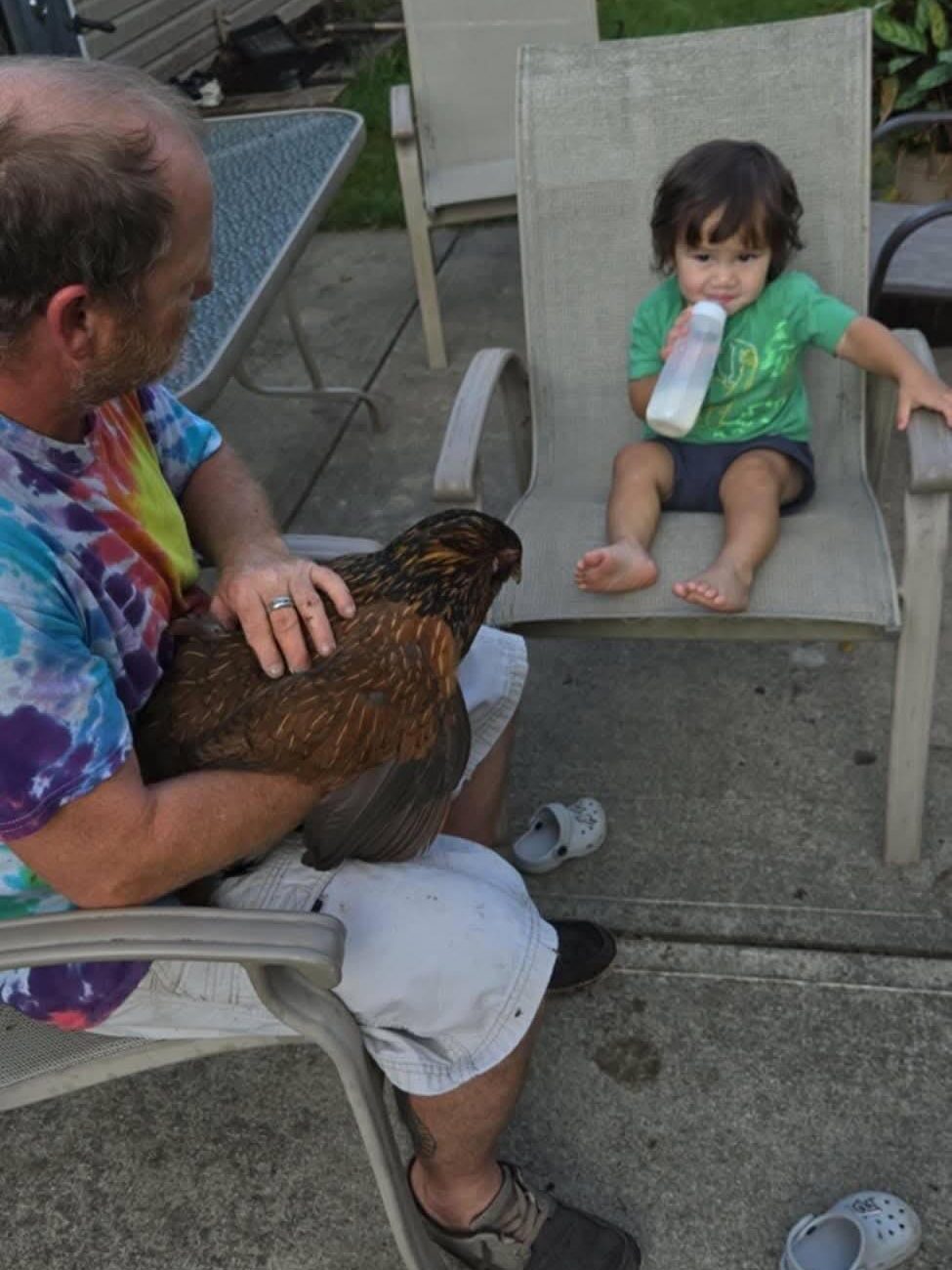 For Combs, his chickens also helped him connect to his children. He would watch with delight as his toddler, Arkyn, would knock on the garage door, where the birds were let in for a time, and greet the chickens.