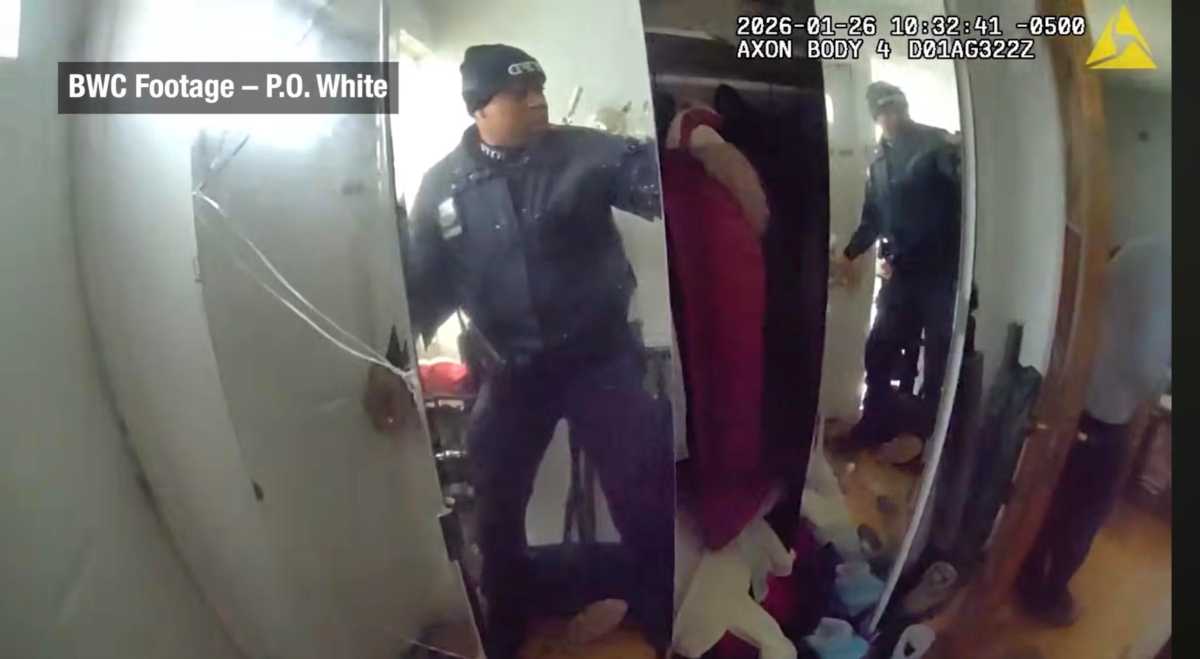 The full video shows two officers from the 107th Precinct arriving at the Briarwood home of Jabez Chakraborty around 10:25 a.m. on Jan. 25. Chakraborty’s mother greeted them at the door and let them inside when Jabez appeared from the kitchen in the rear of the residence, brandishing a knife.