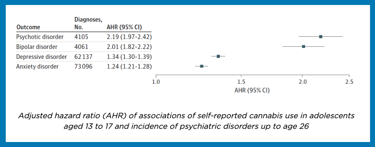 A Kaiser Permanente analysis of adolescents aged 13-17 finds that those who report using cannabis in the past year are more likely to later receive a diagnosis of psychotic, bipolar, depressive, or anxiety disorders.