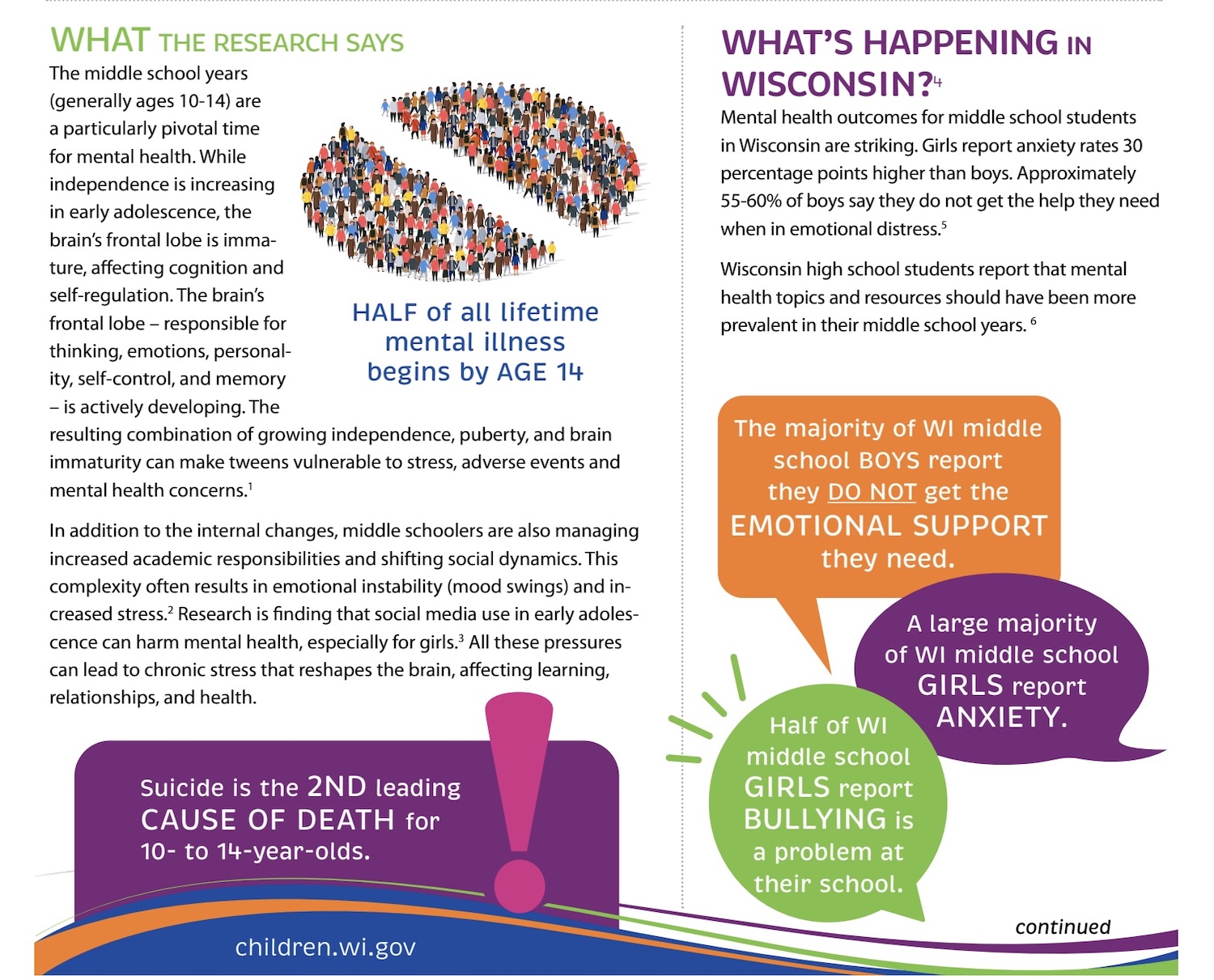 Known as tweens (between childhood and teenage years), this group of children is managing increased academic responsibilities and shifting social dynamics while fluctuating hormones and identity formation are swirling internally. This often results in hallmark mood swings, according to the latest fact sheet from the Wisconsin Office of Children’s Mental Health (OCMH).