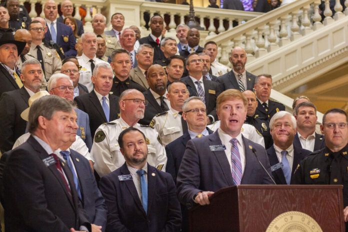 The Georgia Senate moved to pass Sen. Blake Tillery’s $409 million budget adjustment to build a forensic mental health hospital on Feb. 20, 2026. He announced the measure just before the Senate vote, flanked by lawmakers and local sheriffs.