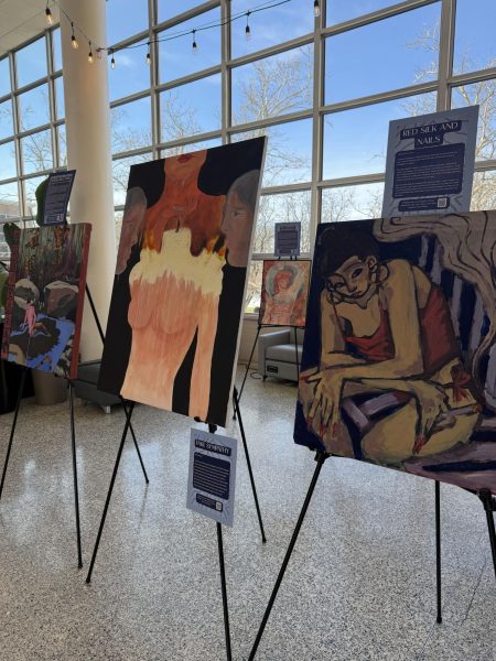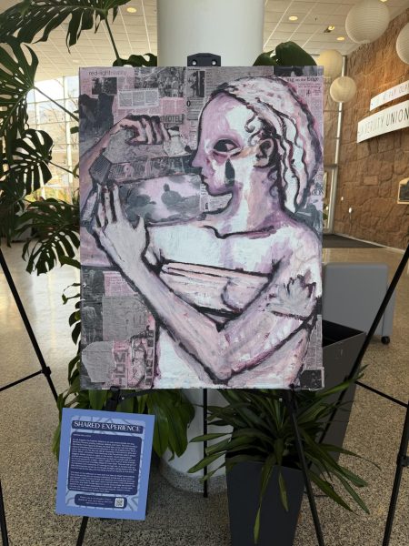 Walking into the Union Lobby, several pieces are showcased of different mediums, though the clear aligning factor among all of them is a profound connection to the artist’s struggle and expressions.