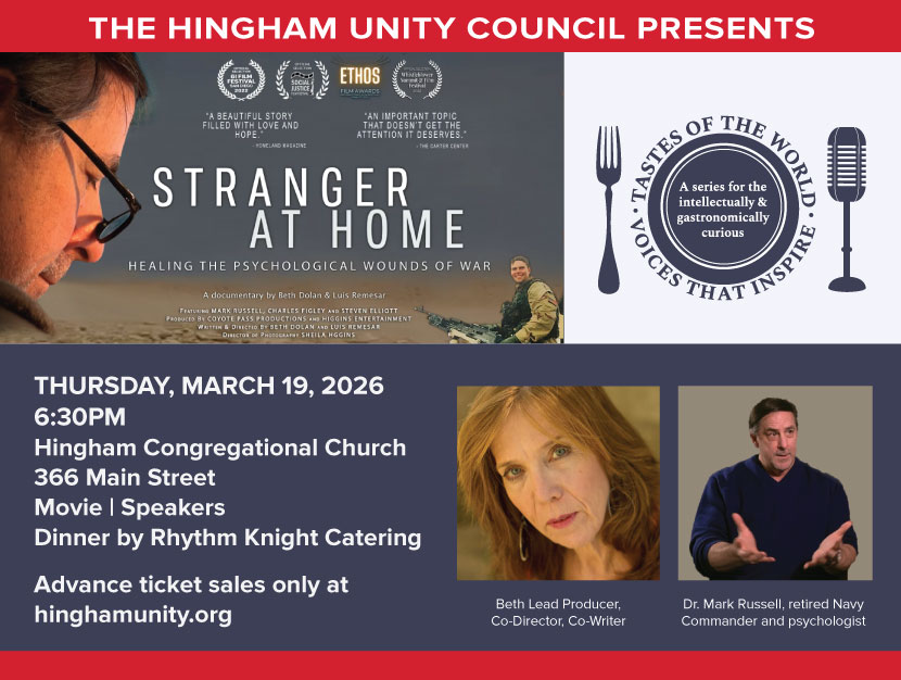The Hingham Unity Council continues its āTastes of the World, Voices that Inspireā dinner/speaker series on March 19 with a screening of the PBS documentary Stranger at Home: Healing the Psychological Wounds of War.