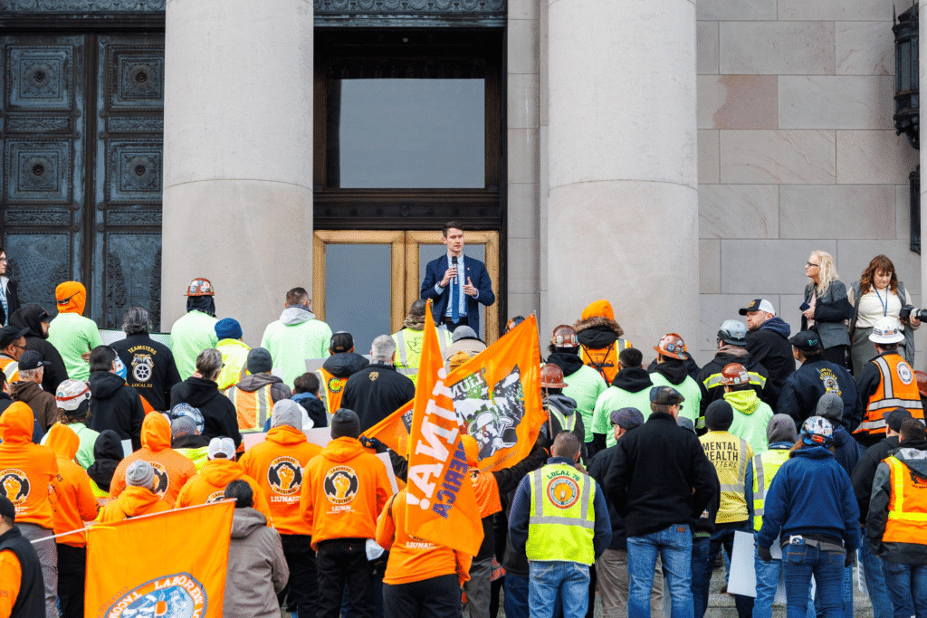 State Rep. Greg Nance, D-Bainbridge Island, speaks at a Building and Trades rally in Olympia on Feb. 17, 2026.