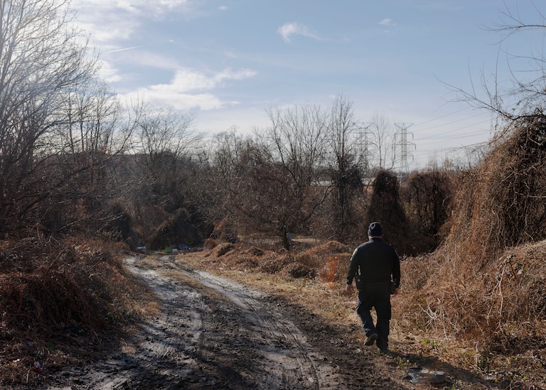 A Baltimore Police officer walks down a trail to pick up belongings for an unhoused person. (KT Kanazawich for The Banner)
