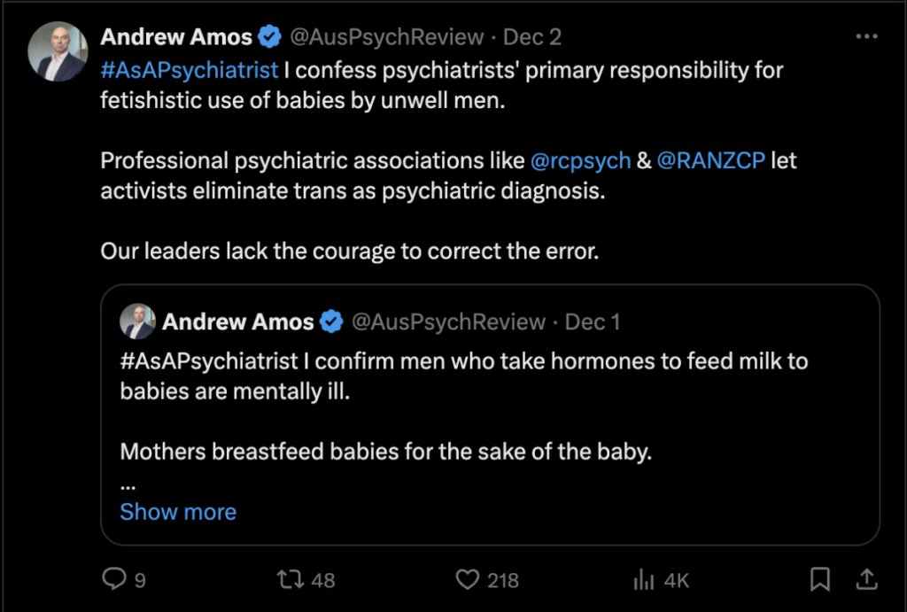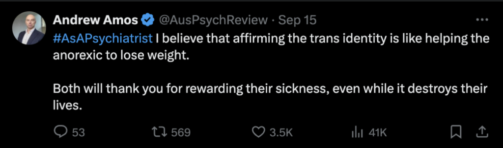 While Dr Amos’ X account no longer exists after the ban, Star Observer was able to source screenshots that showcase his misinformation narrative around trans identity being a “mental illness”.