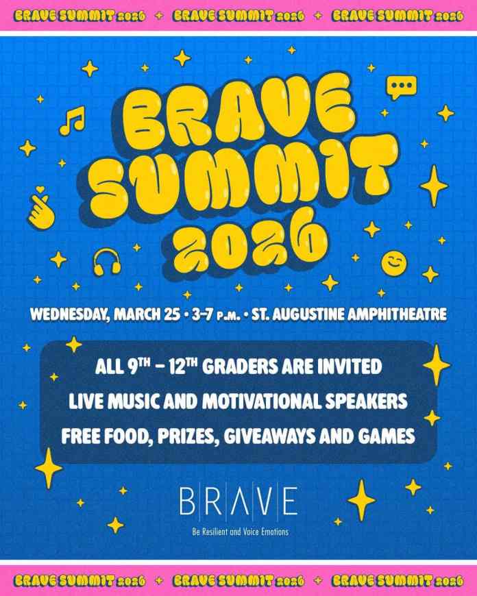 UF Health St. Johns will host St. Augustine’s BRAVE Summit on Wednesday, March 25, at the St. Augustine Amphitheatre from 3 to 7 p.m. The free event is open to all Florida high school students