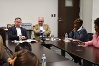 From left, Rep. Eugene Vindman and Sen. Tim Kaine listen to staff members during a March 9, 2026, roundtable at the Prince William County Crisis Receiving Center in Woodbridge – as Andrea Bailey, Potomac District supervisor, and Princess Clark-Wendel, a community services staff member, look on.