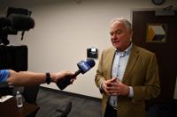Sen. Tim Kaine speaks to the media on March 9, 2026, at the Prince William County Crisis Receiving Center in Woodbridge.