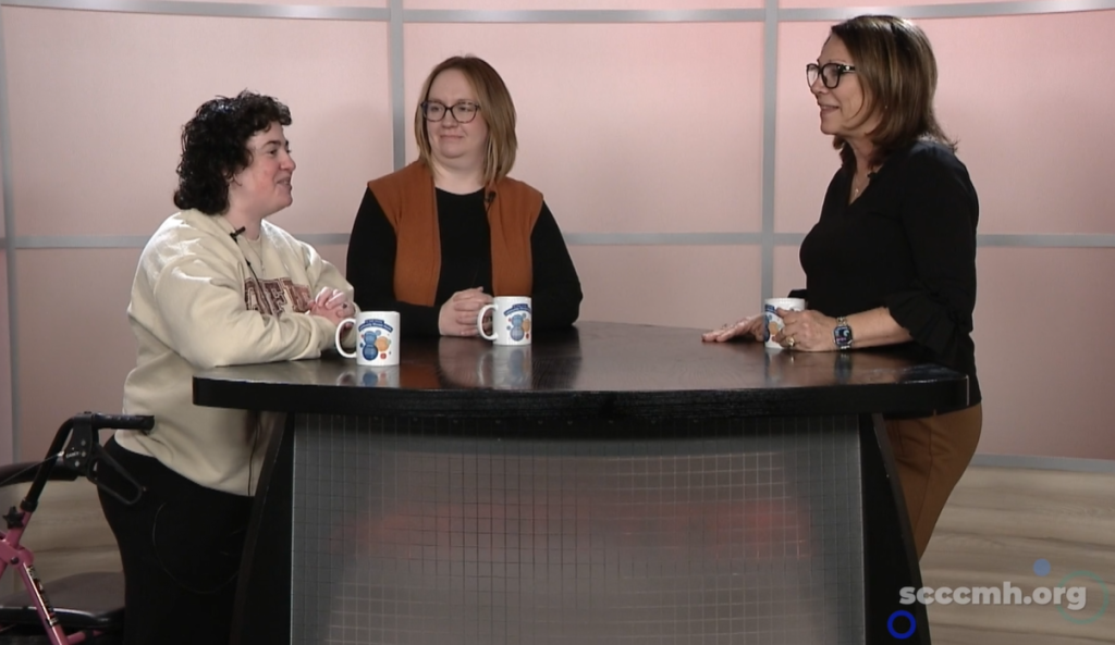 Kortney Folske participates in a Healthy Minds, Healthy Bodies interview for March, Developmental Disabilities Awareness Month with her case manager Amy Davidson-Guilliams and SCCCMH CEO Deb Johnson. Courtesy.