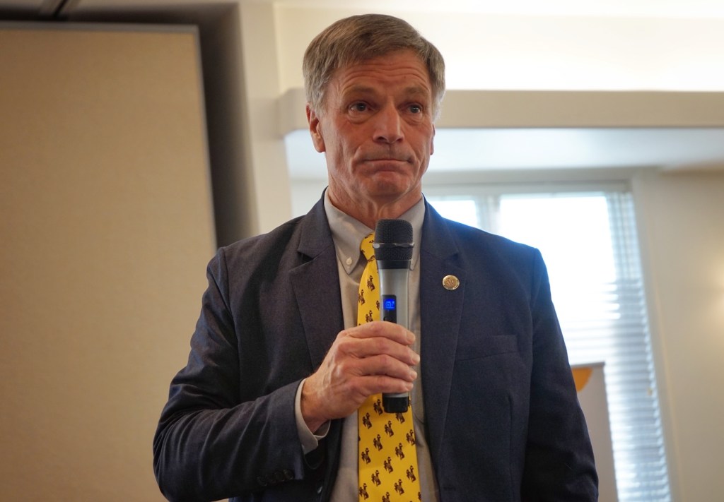 Gov. Mark Gordon answers a question during a League of Women Voters town hall in Lander on Oct. 23, 2025. (Katie Klingsporn/WyoFile)