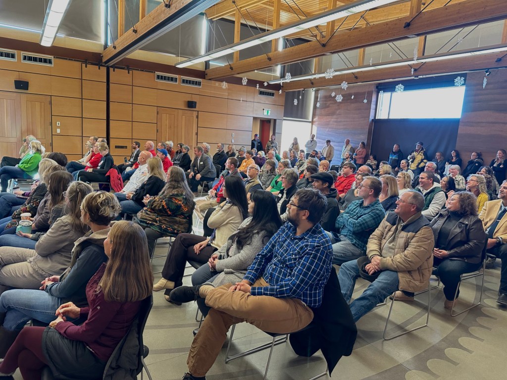 Sublette County residents packed the local library’s auditorium Dec. 15, 2023 for a town hall-style meeting focused on Wyoming’s mental health challenges and resources. Gov. Mark Gordon led the event. (Mike Koshmrl/WyoFile)