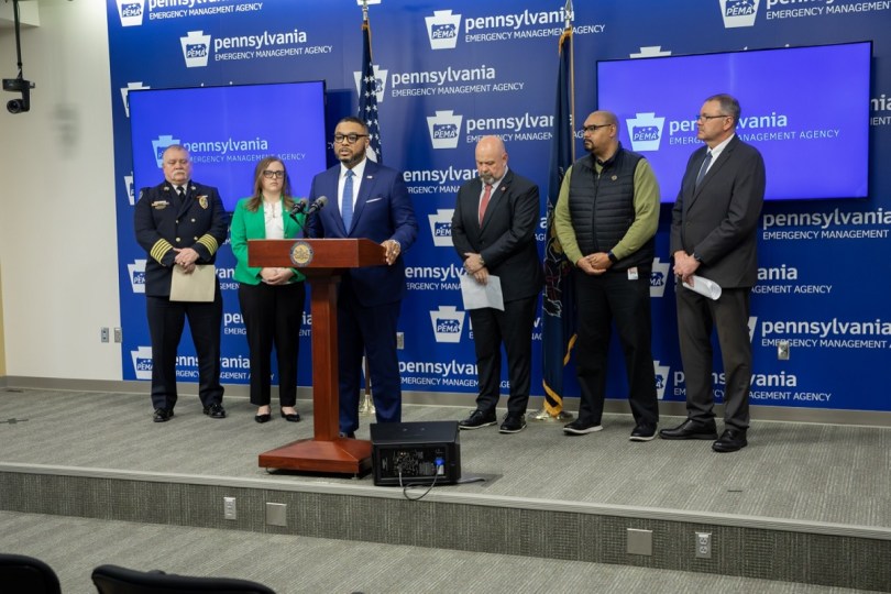 Lt. Gov. Austin Davis speaks during Tuesday’s press conference at PEMA.