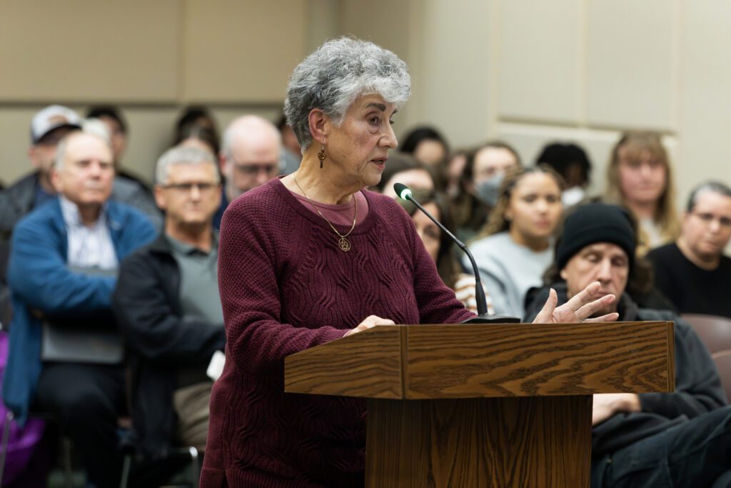 Irene Morgan speaks during a public comment session for a meeting to discuss the new jail design at the Lynden City Annex Chamber. (Andy Bronson/Cascadia Daily News)