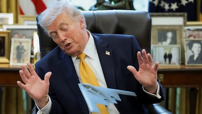 Donald Trump looks at a model of a B-2 bomber commemorating “Operation Midnight Hammer” on March 16, 2026. Jonathan Ernst (REUTERS)
