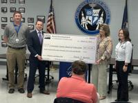 USDA Rural Development Kentucky State Director Travis Burton (left) and Crittenden County Schools Superintendent Tonya Driver (right) hold the check for a $853,043 grant from the U.S. Department of Agriculture’s Distance Learning and Telemedicine Program.