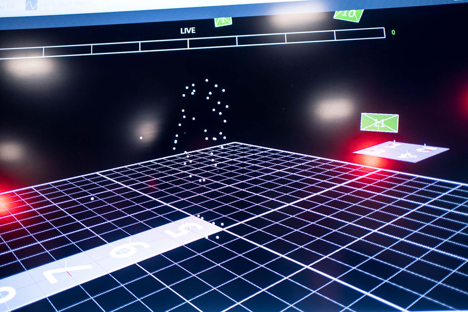 The computer screen shows the marker trajectory during a motion capture experiment.