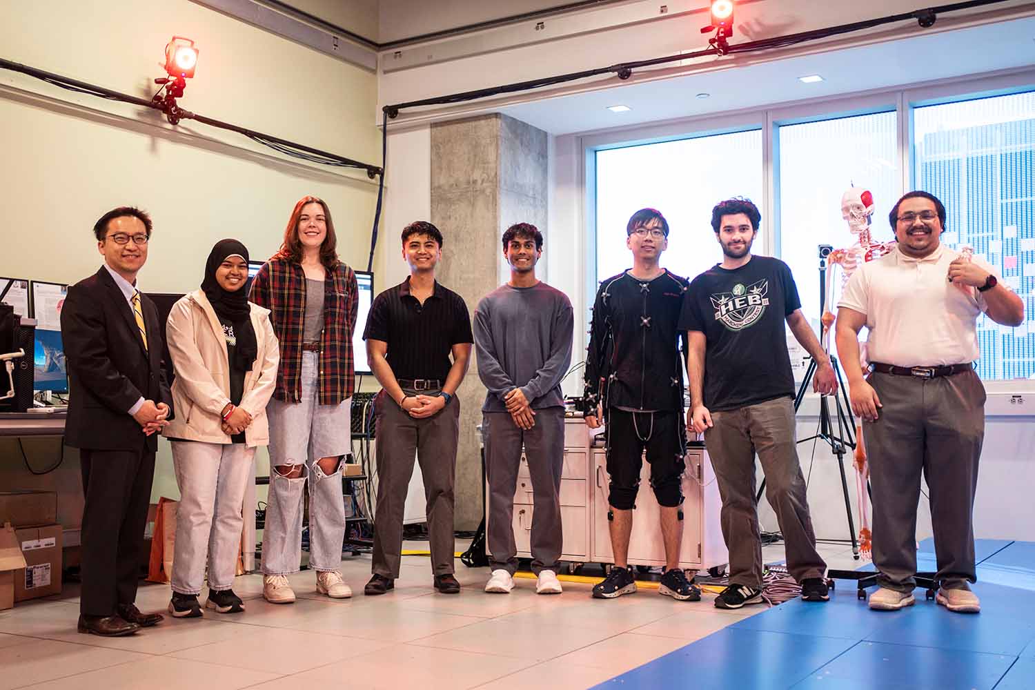 Biomedical engineering senior Ian Y. Kim wears a motion capture suit during an experiment in the Neuromuscular and Musculoskeletal Biomechanics Lab at UT Dallas.