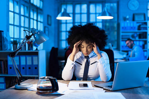 Young adult businesswoman with afro hairstyle feeling exhausted and overwhelmed while working overtime at her desk in a blue-lit modern office environment
