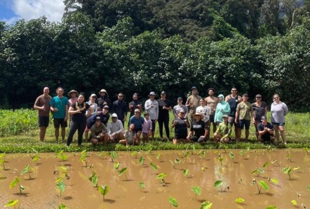 A total of 14 farmers, five emergency medical services personnel and three people from Office of Wellness and Resilience spent a day in the loʻi at Hoʻokuaʻāina to restore and connect together in March. (Courtesy Photo: University of Hawaiʻi)