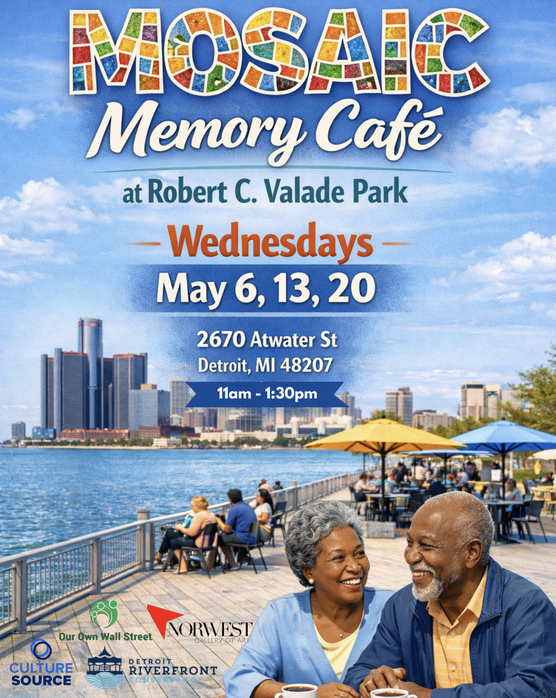 Mosaic Memory Cafes in Detroit: If you’re in the Detroit area and looking for a pleasant, relaxed outing for you and your loved one living with memory loss or dementia, plan to attend one or all of the upcoming Wednesday art gatherings at Detroit’s Robert C. Valade Park, right on the river. Designed for people with memory loss or dementia and their caregivers, the sessions are led by trained facilitators. Each gathering will feature light movement and exercise for seniors, a guided art-making experience, and a closing reception for participants and their families.