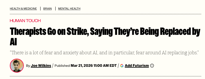 But the situation isn’t being discussed as an attempt of management to cheapen care. It is instead being framed as a question of whether AI will or should replace therapists.