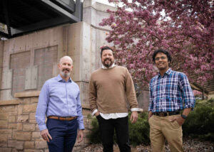 Brent Kious, Zac Imel and Vivek Srikumar, left to right, conduct interdisciplinary research into ways to improve psychotherapy through the use of automation. These University of Utah researchers are based in the School of Medicine, College of Education and College of Engineering, respectively. Photo by Dan Hixson.