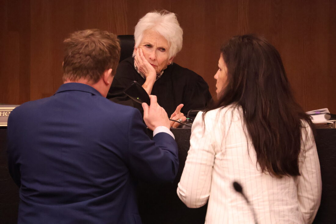 Judge Sally Pokorny speaks with former Douglas County District Attorney Suzanne Valdez and defense attorney Dakota Loomis, who is currently DA, during a trial on May 30, 2024.