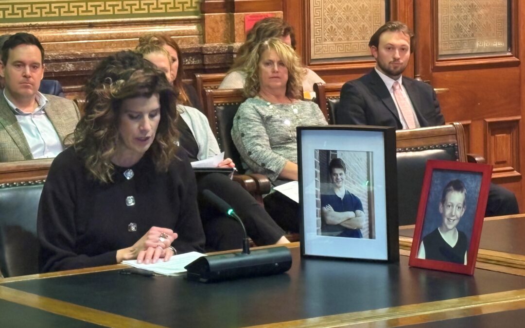 Mary Neubauer of Clive, with a photo of her son, testifying at committee hearing in Jan. 2026. (RI file photo)