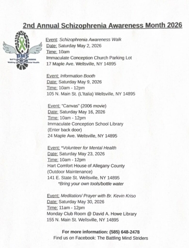 BMS is hosting our 2nd Annual Schizophrenia Awareness Month in May. Each event will focus on creating awareness and allowing all who attend an opportunity to learn about schizophrenia and mental health. The first event will be an awareness walk in Wellsville. The second event will be an information booth where people can learn about schizophrenia and what type of services are available. The third event will be a movie titled “Canvas” (2006 movie). This movie is based on a true story about a woman and her family and her struggles with schizophrenia. The fourth event is a volunteer day at Hart Comfort House of Allegany County. The last event for the month will be a meditation and prayer which Br. Kevin Kriso, OFM